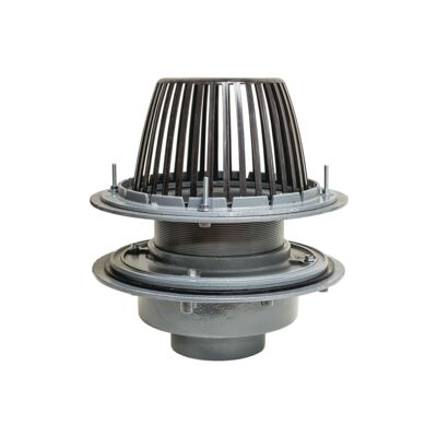 Roof drains large area roof drain series rd 100 epoxy coated cast iron roof drain with flashing clamp with integral gravel stop self locking polyethylene dome standard and no hub standard outlet.